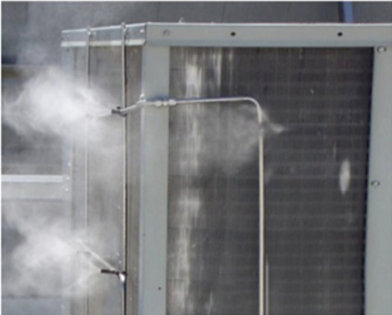噴霧降溫系統(tǒng):水壓提高到2-10公斤,然后將加壓后的水經(jīng)耐壓輸送管道由專(zhuān)業(yè)噴嘴將其霧化,產(chǎn)生200μm左右的微霧顆粒,使其能夠迅速?gòu)目諝庵形諢崃客瓿善U(kuò)散,從而完成空氣加濕、降溫的目的。